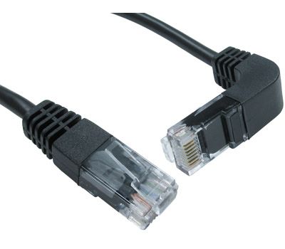 The straight to right angled Cat5e cable is ideal for situations where space is limited or angled connectors are prefered. The position of the cable from the angle will either be going up or going down depending on the position of the port it is going in. If the position of the latch on the cable is pointing down, the cable will point downwards. If the position of the latch on the cable is pointing upwards, the cable will point upwards...