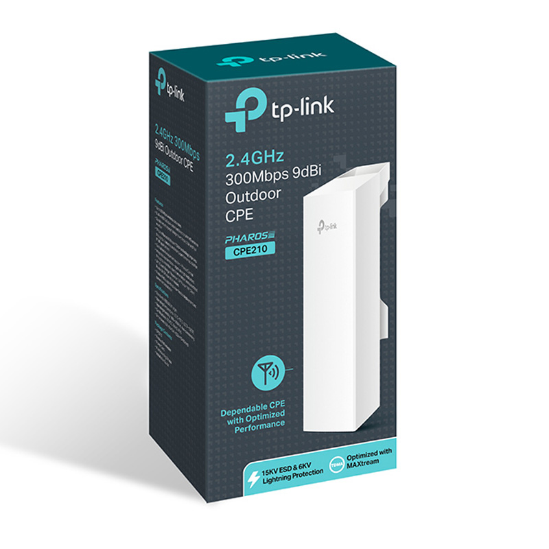 TP-LINK’s 2.4GHz 300Mbps 9dBi Outdoor CPE, the CPE210 is dedicated to cost effective solutions for outdoor wireless networking applications. With its centralized management application, it is ideal for point-to-point, point-to-multipoint and outdoor Wi-Fi coverage applications. Professional performance, coupled with user-friendly design, makes CPE210 an ideal choice for both business and home users.