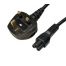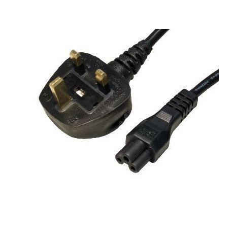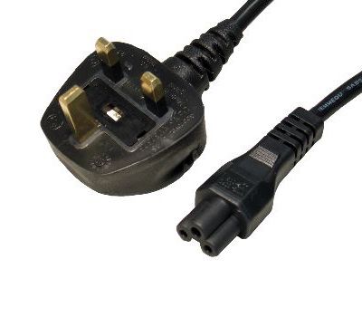 Mains lead with moulded UK plug and three prong 'Cloverleaf' connection.