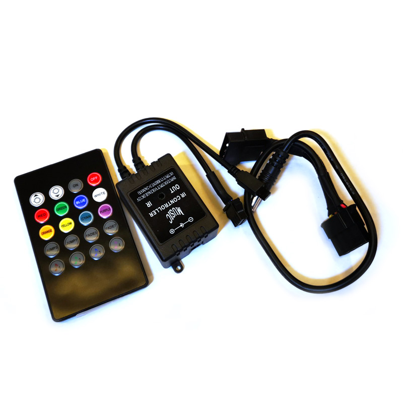 12V RBG LED controller kit with remote. Includes 19" DC-to-MOLEX (4pin) adapter cable to power up from the computer power supply.