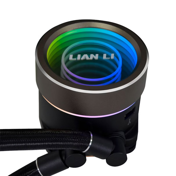 An aluminum housing cap with duo infinity mirror rings and a Lian Li logo at the center.