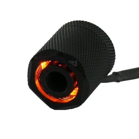 This barb fitting is ideally suited to connect our CF 16/13 mm PETG tubes (or any other acrylic tubes with identical dimensions) and components with a G 1/4 inner thread in a water cooling circuit. The nut is used for stability and ensures an attractive appearance. The fitting comes with a specially designed LED light with 6 LEDs included. The PETG tubes are continuously illuminated by the LEDs and shine in the respective color. The LEDs illuminate specifically the cut surface of the PETG tubes and thus achieve a particularly impressive luminosity.