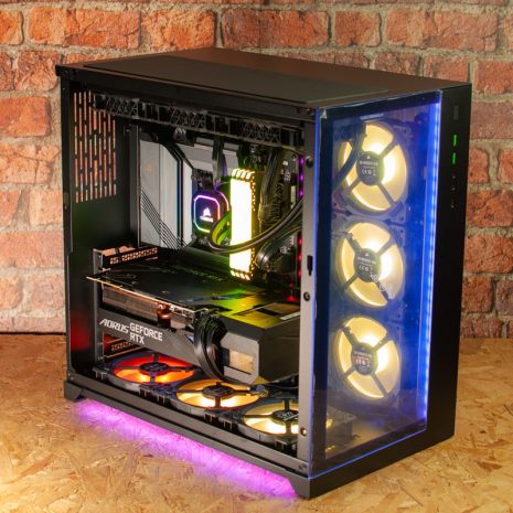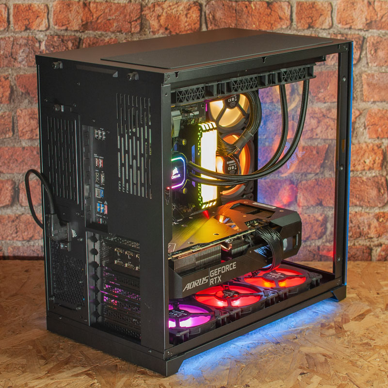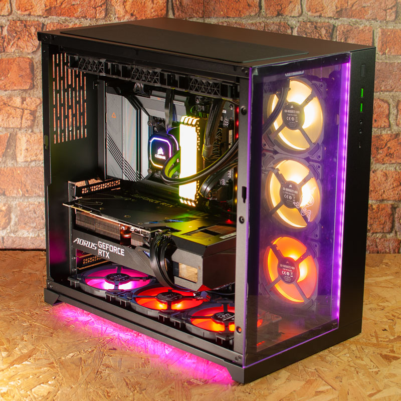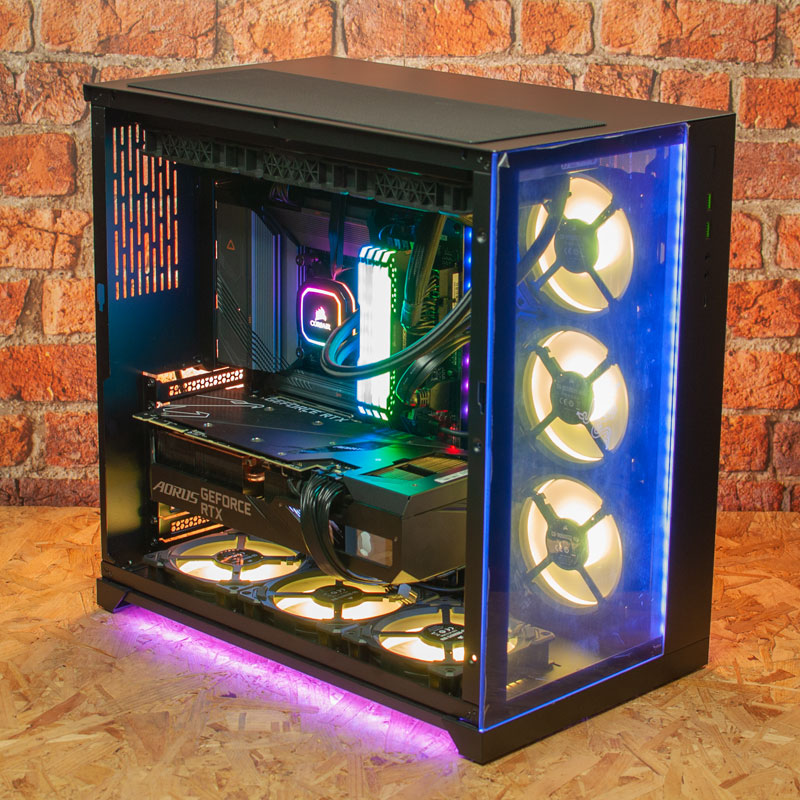 The system is housed in a striking Lian Li PC-O11D Razer edition case with ARGB light strips on the front and base of the case - this can be set to a static colour or strobe in a pattern if you prefer, and looks great. The memory, CPU cooler and 6 of the case fans are all Corsair models which can be controlled through Corsair iCue software.