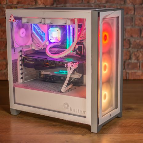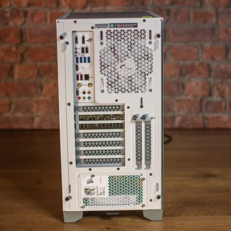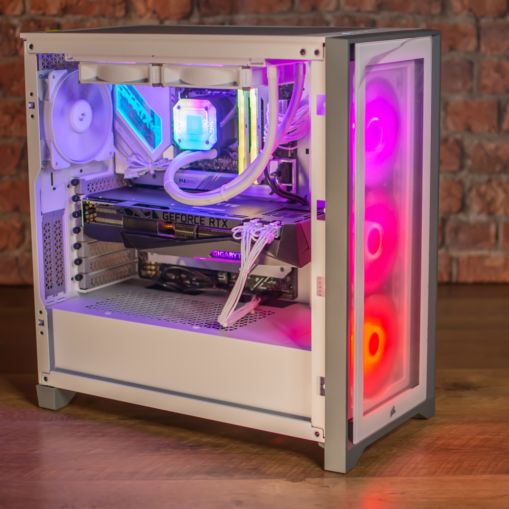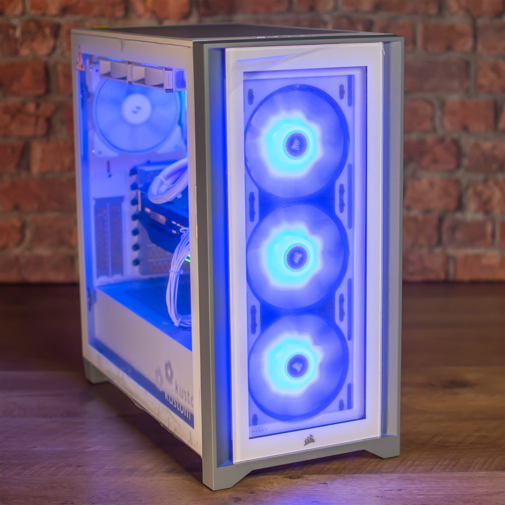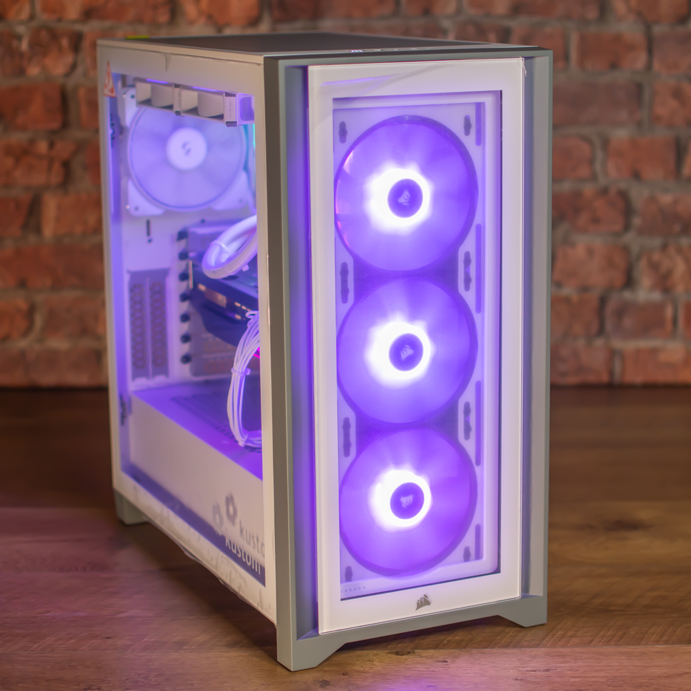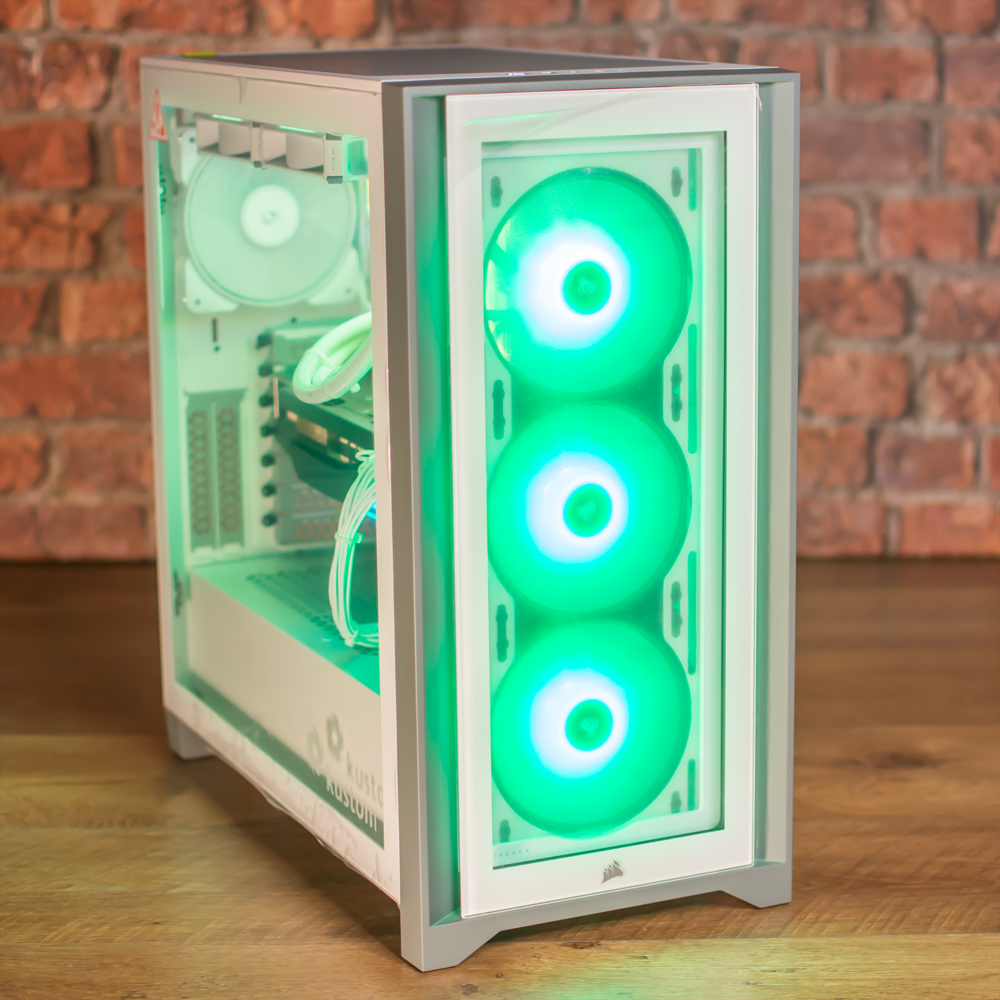 Case is a Corsair 4000X which is a medium sized tower in white with a glass front and left side, and we've used a Corsair Elite Capellix cooler which includes 2 matching fans in the top of the system, and additionally fitted white Corsair RAM which has RGB illumination. The lights on the case, cooler and RAM and controlled in Corsair iCue software, and includes ability to do chase patterns through a sequence of fans (see the side-view pictures above) so is a bit fancier than most lighting control.
