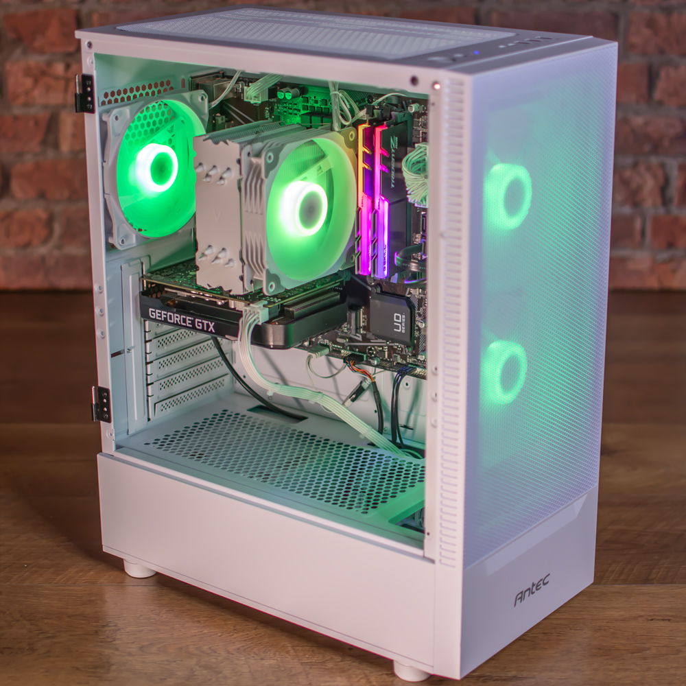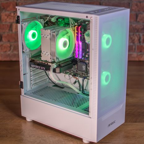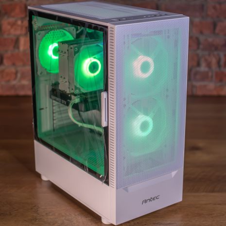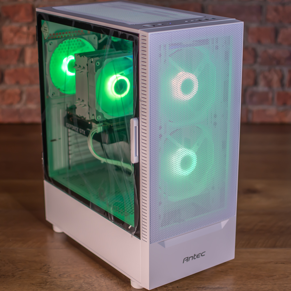 This is fitted in a new Antec NX410 case with glass left side, with 3 x ARGB fans with selectable colour. The cooling is great with larger 140mm case fans up front to push more airflow through the system and the processor sits under a suitably chunky cooler to keep temperatures in check.