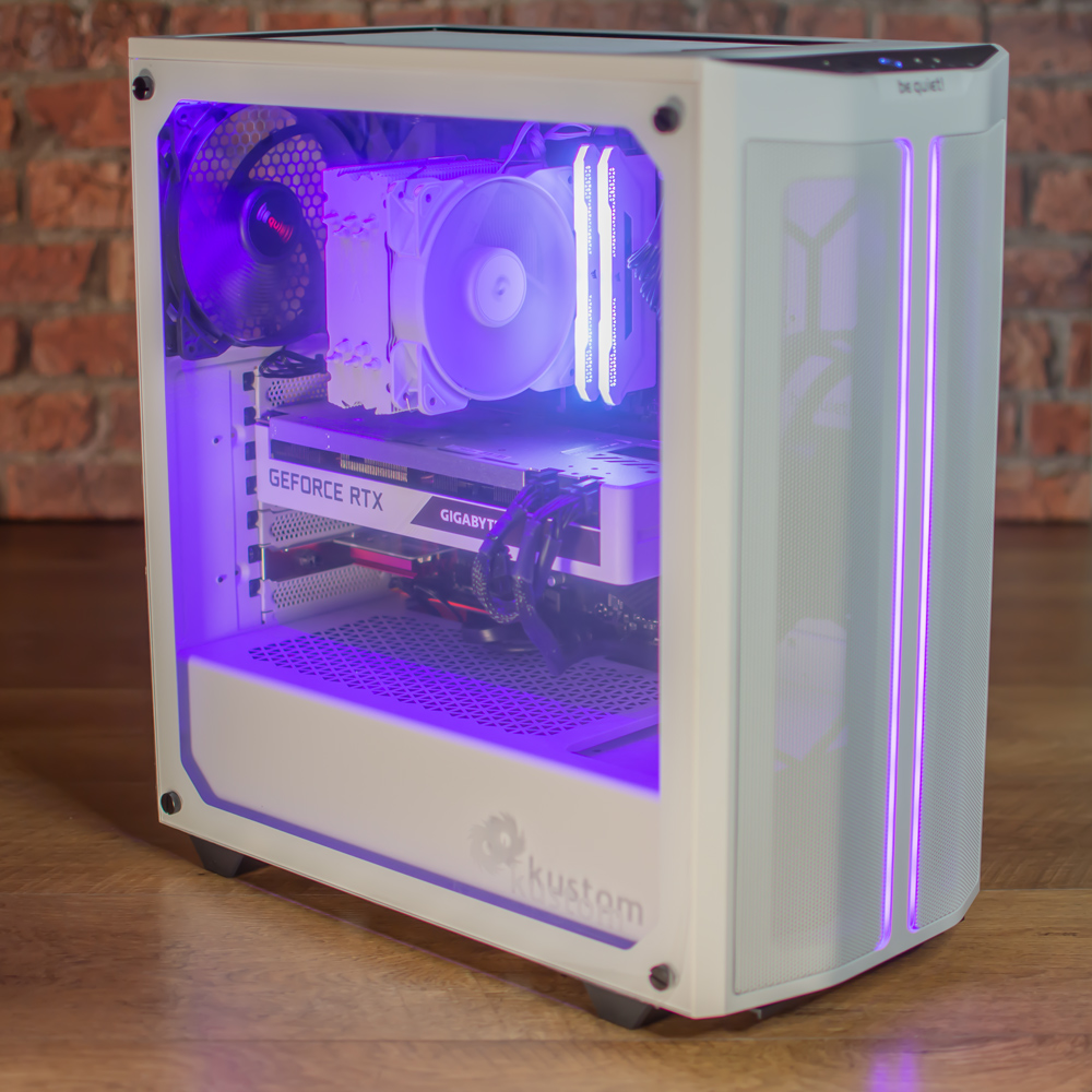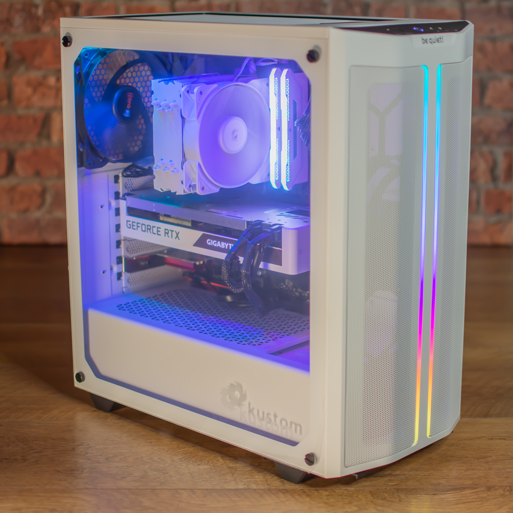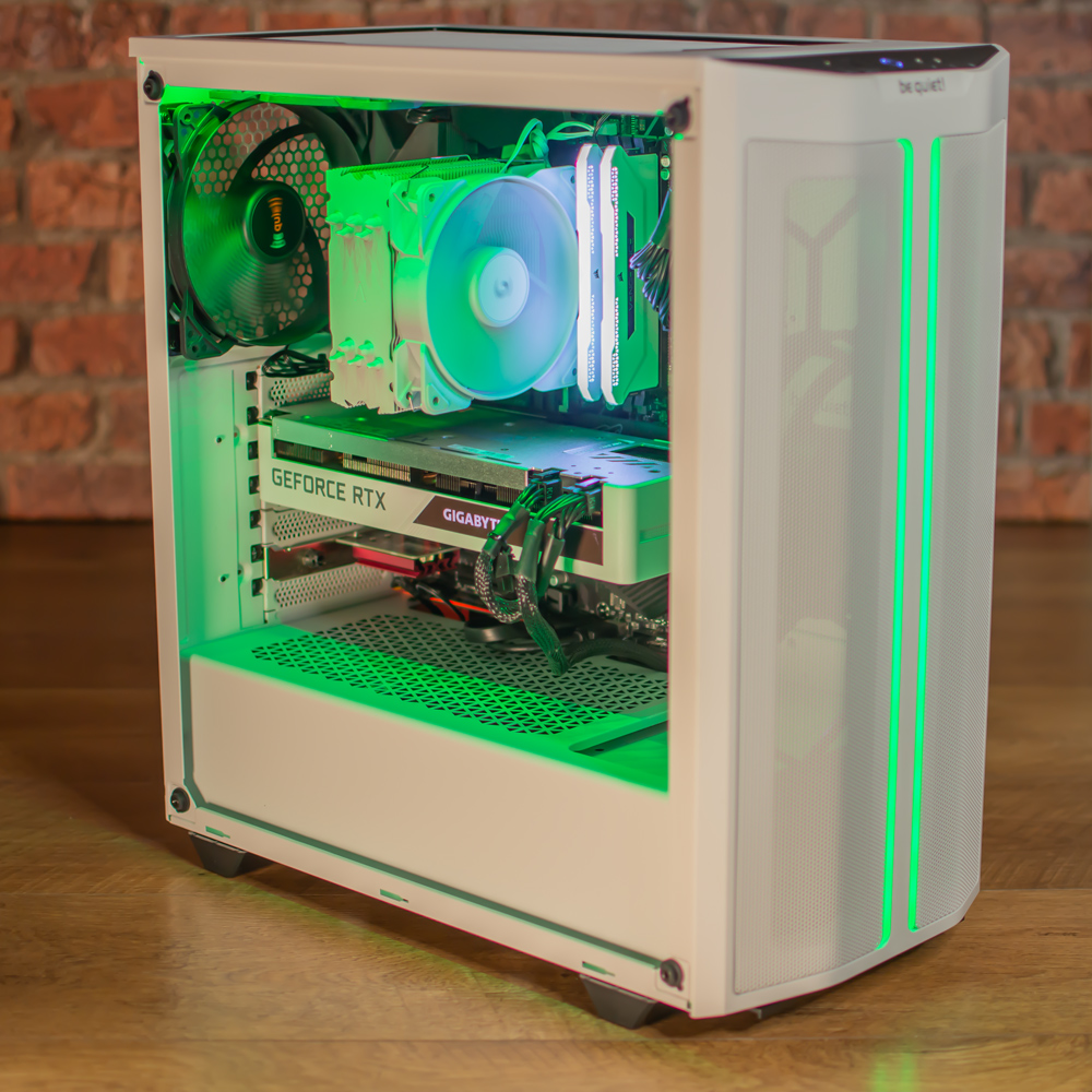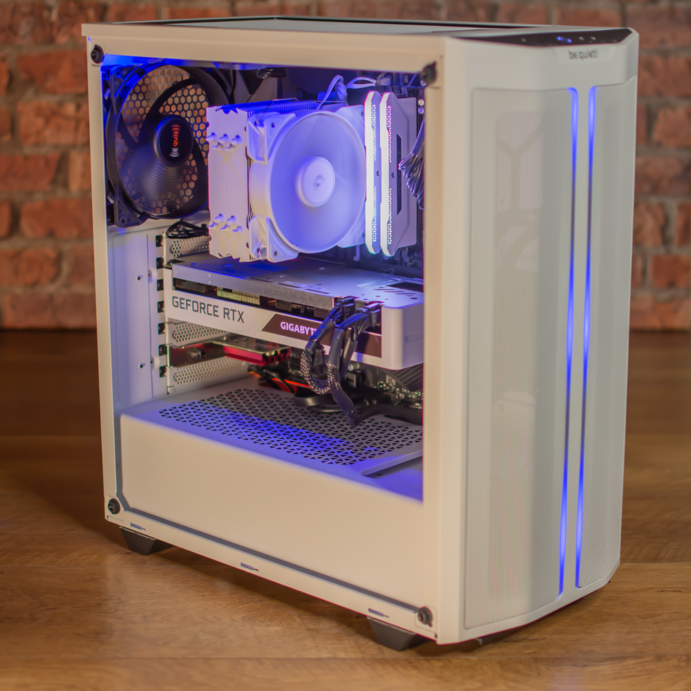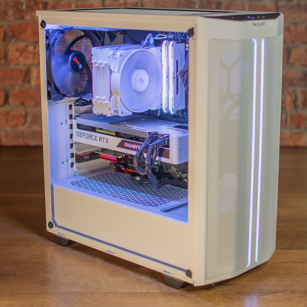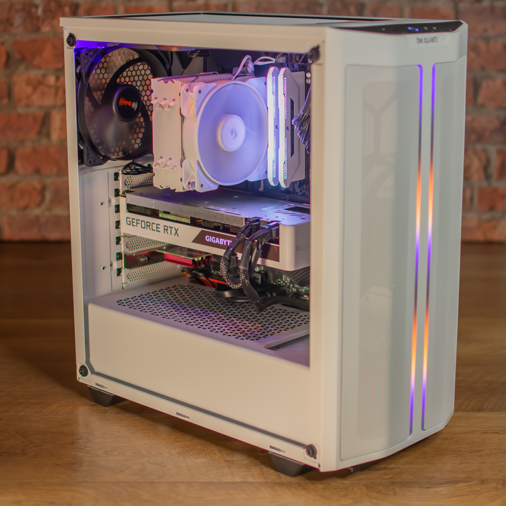 Housing the parts is a be quiet 500DX case with a mesh front and lighting along the top of the glass and on two strips on the front panel. Complimenting this we have the processor cooler, RAM and graphics card also finished in white.