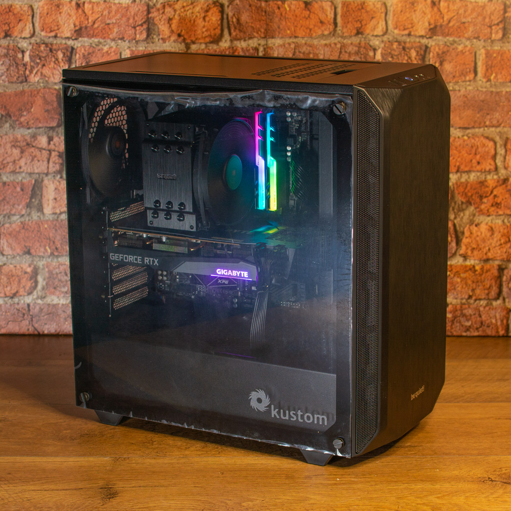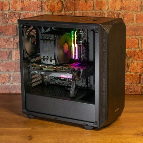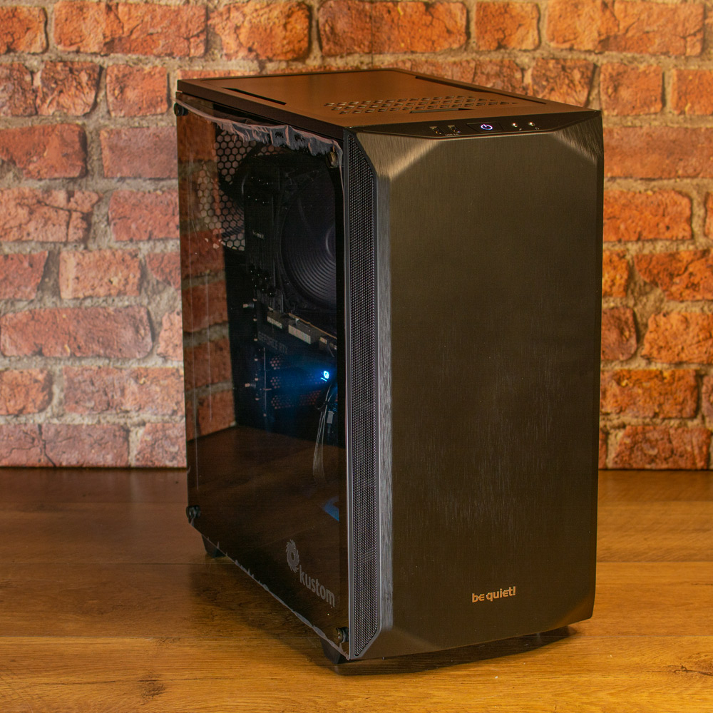 The system is built in a black be quiet Pure Base 500 case with large Pure Wings 2 fans which are effective and quiet, a tinted glass window on the left allows a view of the components inside. A gold rated 650W power supply and large be quiet CPU cooler makes sure this system is stable and well-cooled during long sessions of high usage.