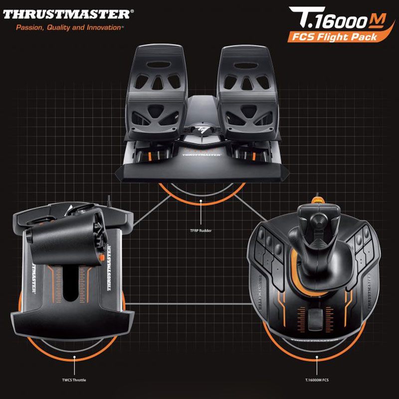 • The T.16000M FCS FLIGHT PACK is composed of the T.16000M FCS (Flight Control System) flight stick, the TWCS (Thrustmaster Weapon Control System) throttle and the TFRP (Thrustmaster Flight Rudder Pedals).