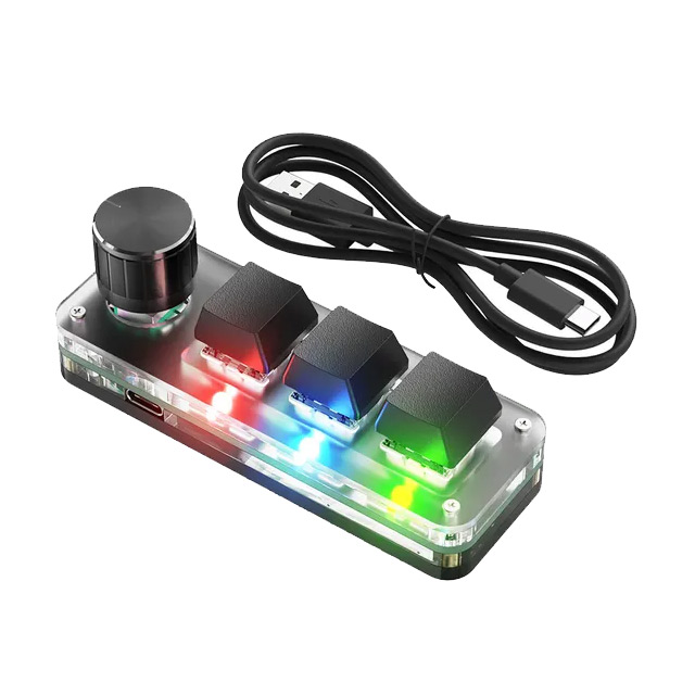 3 key programmable controller with rotary knob (which has both direction and additional 7th button push) with Red Outemu mechanical switches and RGB lighting.