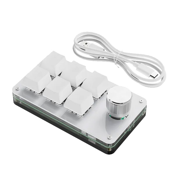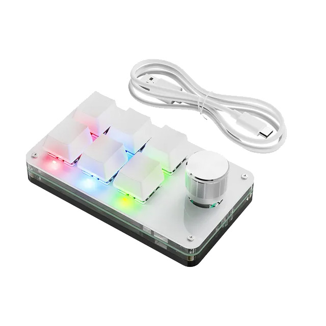 6 key programmable controller with rotary knob (which has both direction and additional 7th button push) with Red Outemu mechanical switches and RGB lighting.